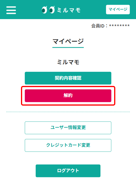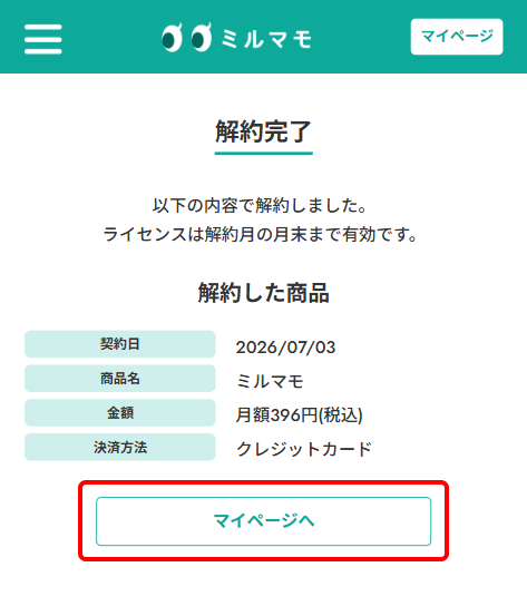 5.解約完了ページ内の「マイページへ」ボタンをタップ