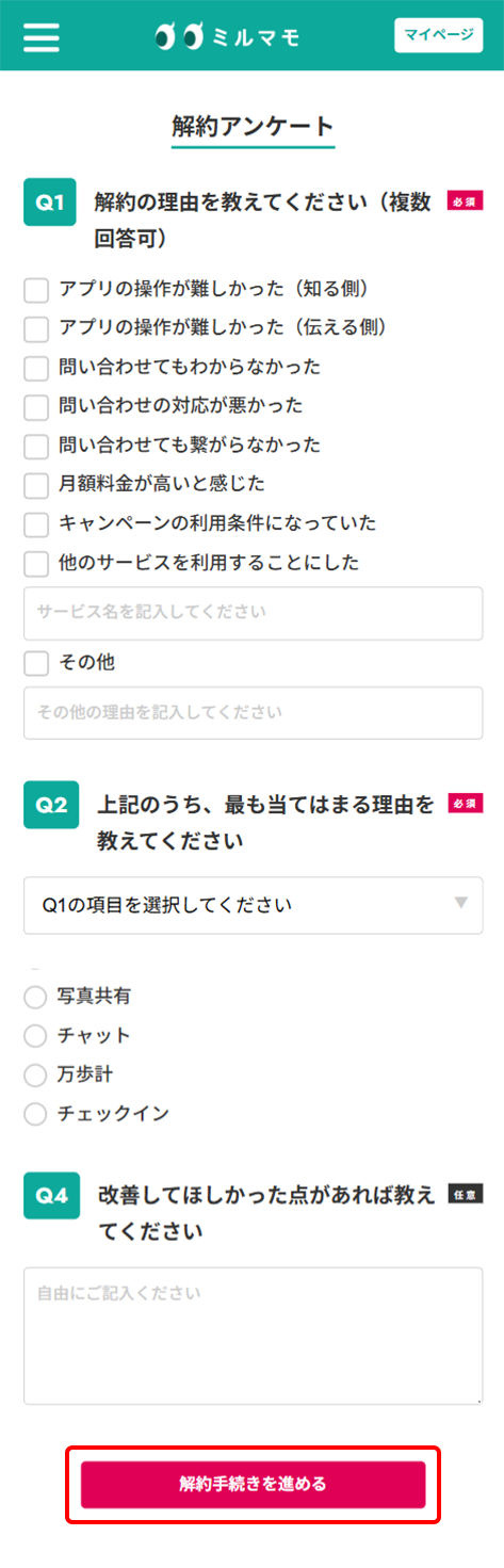 3.解約アンケートをご入力の上、「解約手続きを進める」ボタンを押す