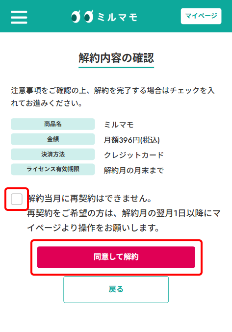 4.解約内容をご確認の上「同意して解約」ボタンをタップ