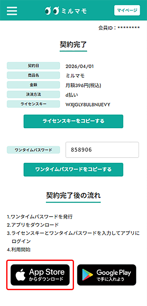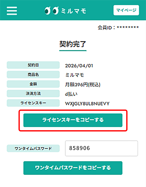 7.月額決済サイトの契約完了ページの「ワンタイムパスワードをコピー」ボタンを押す