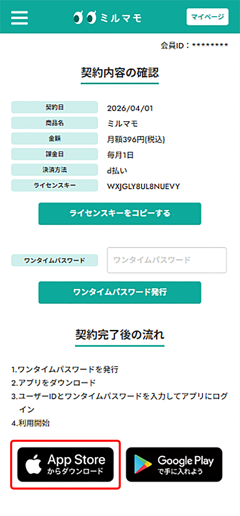 1.契約完了または契約内容の確認ページ下部にある、App Storeボタンを押す