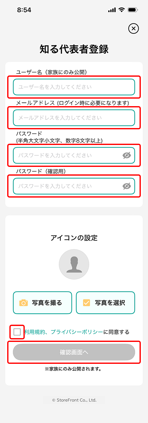 20.「ユーザー名」「メールアドレス」「パスワード」を入力し、「利用規約、プライバシーポリシーに同意する」にチェックを入れ、「確認画面へ」ボタンを押す