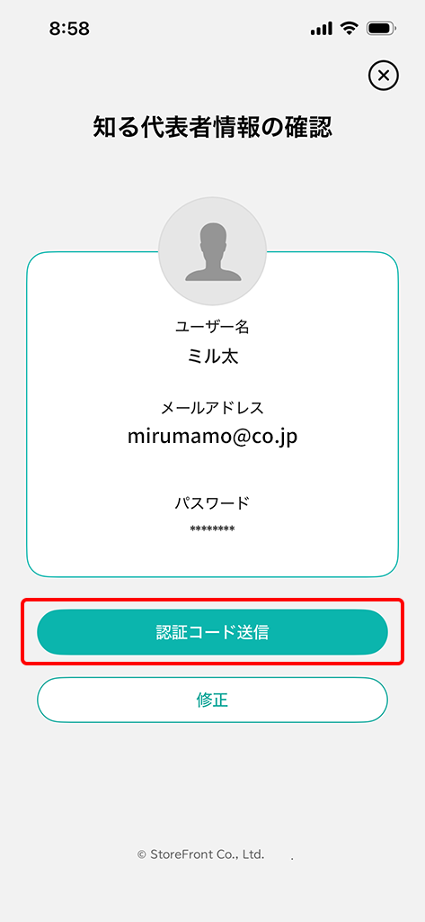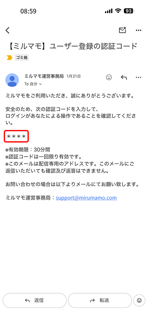 23.「【ミルマモ】ユーザー登録の認証コード」メール内に記載された4桁の認証番号を確認、コピーする