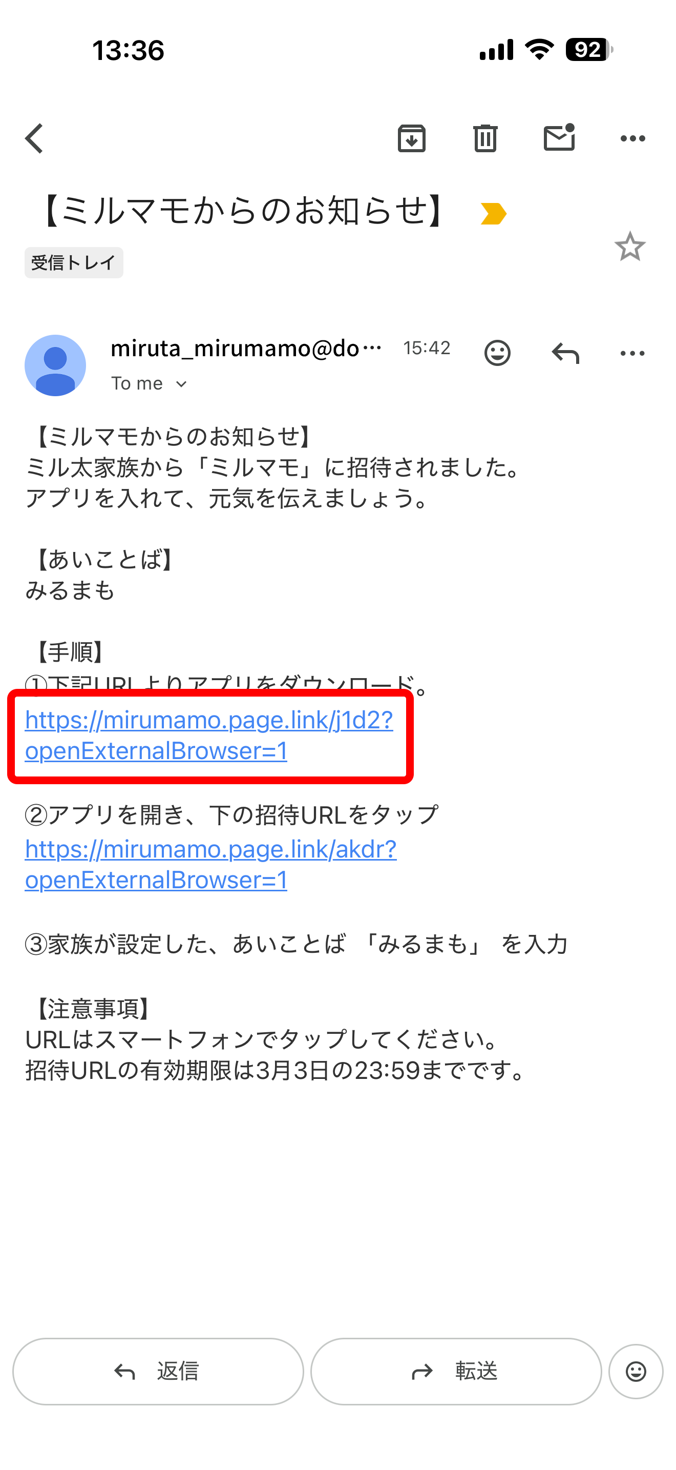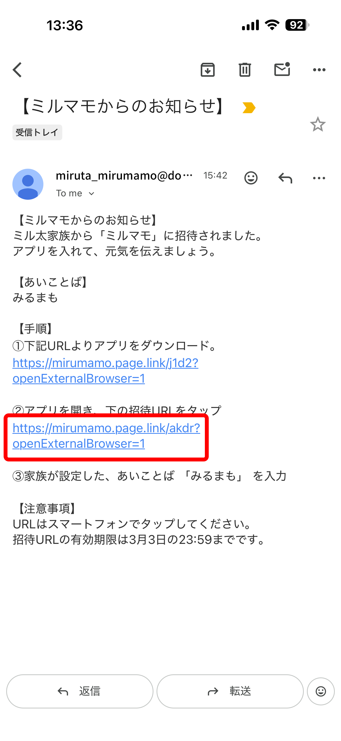 4.知る人から届いた招待メッセージ内②のURLを押す