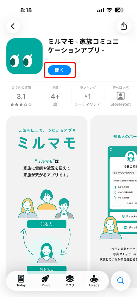 3.「開く」ボタンを押す(ミルマモアプリが起動します)