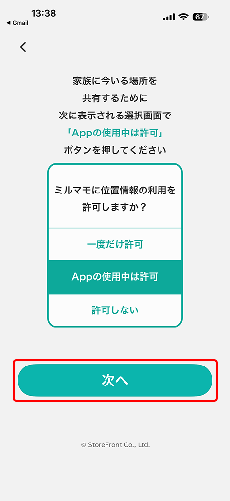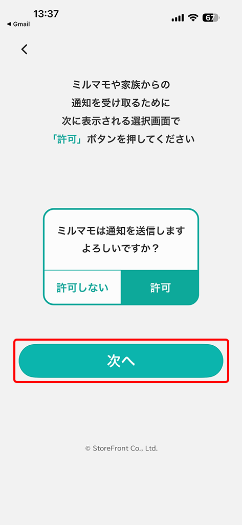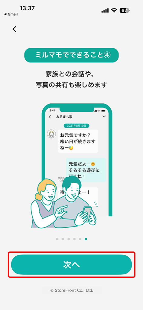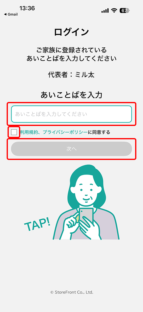 5.知る人から届いた招待メッセージ内に記載の「あいことば」を入力し、「利用規約、プライバシーポリシーに同意する」にチェックを入れ、「次へ」ボタンを押す