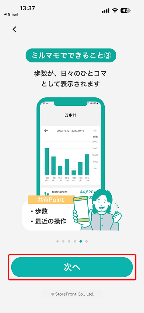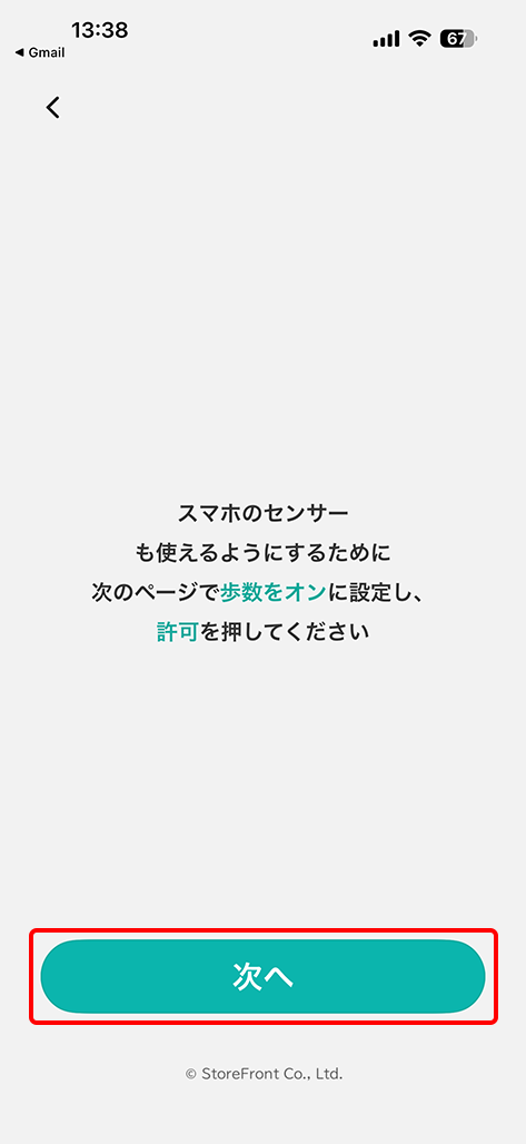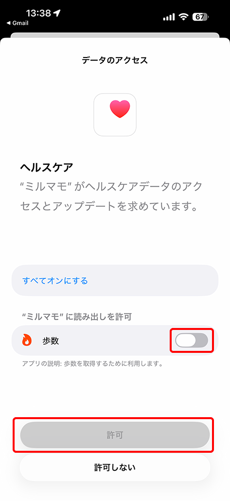 19.「歩数」をオンにし、「許可」ボタンを押す