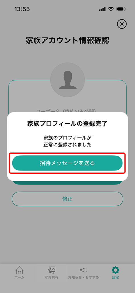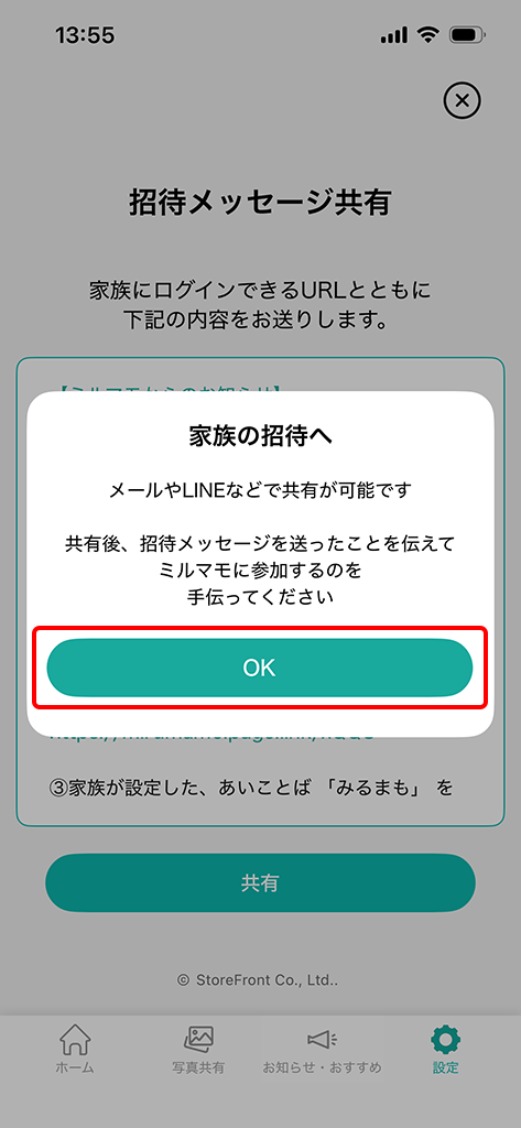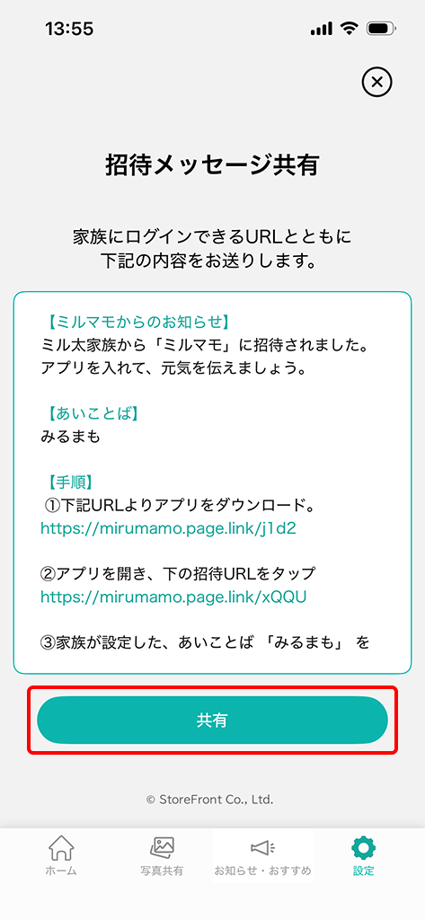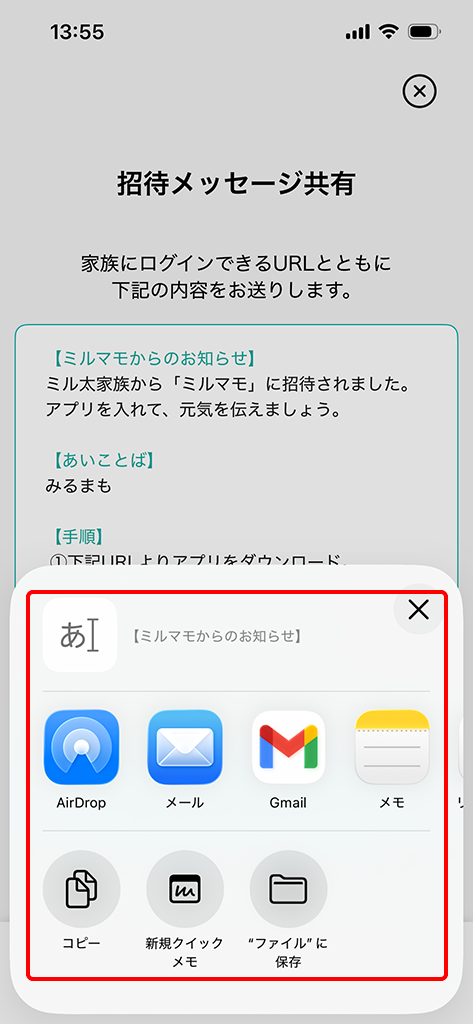 9.SMSやメールなど、招待メッセージを送るツールを選択し、招待メッセージをほかの知る人に送信したらほかの知る人の登録・招待は完了です。