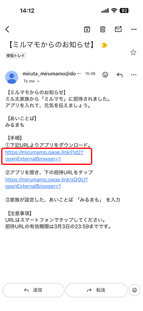 4.知る人から届いた招待メッセージ内②のURLを押す