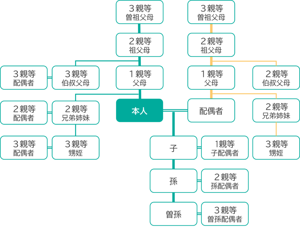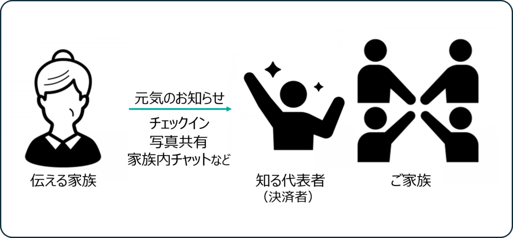 なお、本サービスは、家族間でのコミュニケーションを目的としたサービスであるため、利用者の範囲を決済者(下図の本人)から見て3親等以内の親族とし、それ以外の第三者が本サービスを使用することは、トラブル防止のため禁止するものとします。