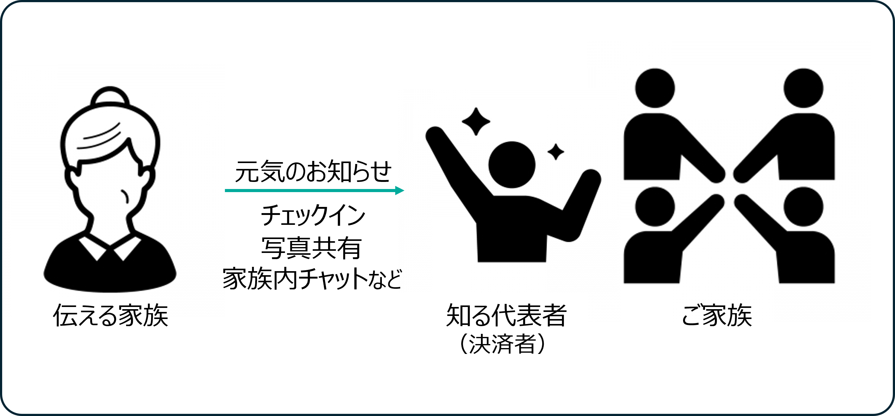 なお、本サービスは、家族間でのコミュニケーションを目的としたサービスであるため、利用者の範囲を決済者(下図の本人)から見て3親等以内の親族とし、それ以外の第三者が本サービスを使用することは、トラブル防止のため禁止するものとします。